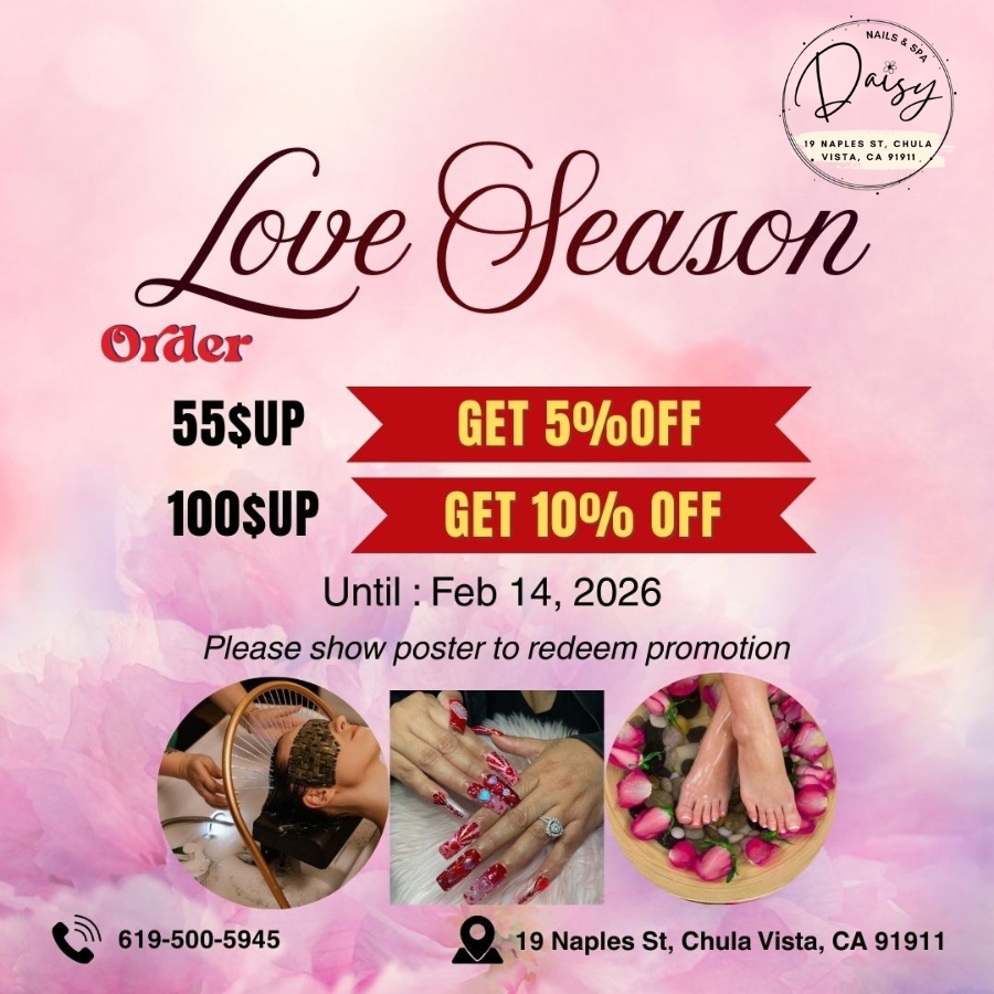 Have a relaxing time and be more beautiful after enjoying high-end services at one of the best nail salons in the industry: Daisy Nails & Spa! Located conveniently in Chula Vista, CA 91911, our nail salon is proud to deliver the highest quality for each of our services. Come to visit our nail salon and enjoy the comfortable relaxing moments by the leading service provided. At Daisy Nails & Spa, you are able to immerse into a cozy and luxurious space, reduce your stress of work, and forget all the life’s pressure. Our valued customers will be satisfied with all the services by our friendly, passionate staff. We always try our best to upgrade all services and give you the best moment. ♦ Manicure ♦ Pedicure ♦ Nail Enhancements ♦ Head Spa ♦ Facials ♦ Eyelashes ♦ Exclusive promotions. Enjoy our wide range of services in a cozy and luxurious environment. We look forward to serving you!